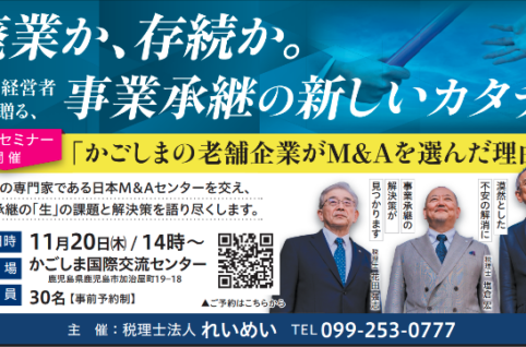事業承継やM&Aをテーマとした無料セミナーを下記の日程で開催いたします。 【開催日時】 11月20日(水)14:00~【会場】 かごしま国際交流センター (鹿児島県鹿児島市加冶屋町19-18)...